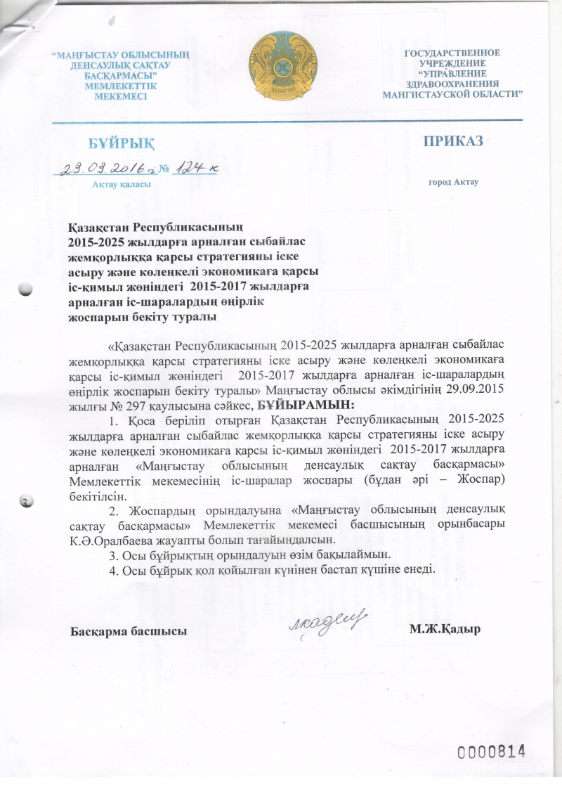 • Қазақстан Республикасының 2015-2025жылдарға арналған сыбайлас жемқорлыққа қарсы стартегияны іске асыру және көлеңкені экономикаға қарсы іс-қимыл жөніндегі 2015-2017 жылдарға арналған іс-шаралардың өңірлік жоспарын бекіту туралы